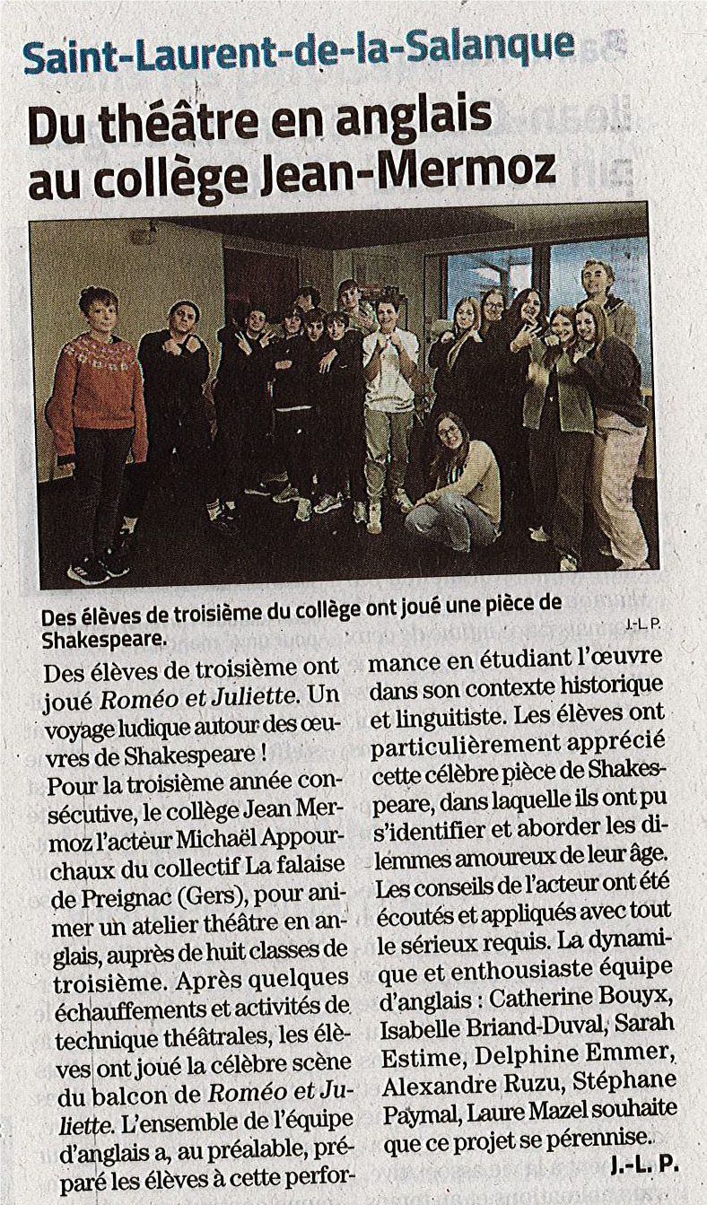 Pour la 3e année consécutive le collège Jean Mermoz de St Laurent de la Salanque accueille l'acteur Michael Appourchaux du collectif “La falaise” *pour y animer un atelier “théâtre en anglais” auprès des 8 classes de 3e.